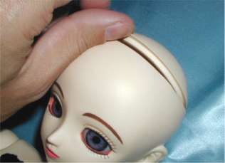 まずは頭のお皿をあけます。額側の方がゴムひもの力が弱いので、そちら側の境目に爪をひっかけて持ち上げます。 |