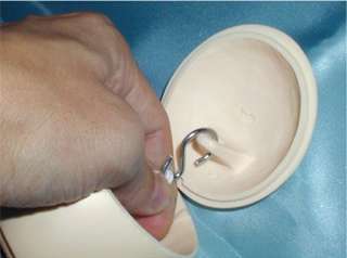 お皿をあけると、Sカンという金具とゴムひもがありますのでお皿をひっぱりあげて、Sカンの根元のゴムひもをもちます。