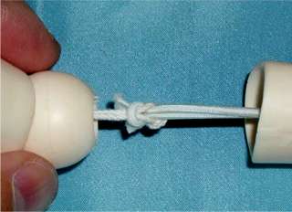 腕パーツは穴が細いのでゴムひもの結び目が抜けにくい場合もあります。思いっきりゴムひもを引張れば抜けますのでがんばりましょう。 そして同じ要領でもう片方の手首パーツの紐とゴムひもの結び目もほどいてしまいましょう。 |