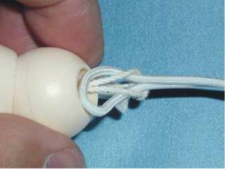 ですので紐の輪を回して、紐の結び目をパーツの中にもっていくと、ゴムひもとの結び目がすっきりして上記の問題がおきなくなります。 |