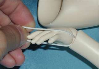 できるだけメイっぱい引張っておきましょう。 ちなみに手首パーツなどは関節球の部分を持つようにしましょう。左の画像は悪い持ち方(^^ゞの例です。 なぜかというと関節球と手のパーツは接着剤でくっついてるだけなので、思いっきり引張るととれちゃうこともあるかもしれないのです(とれたら接着し直すだけですけどね)