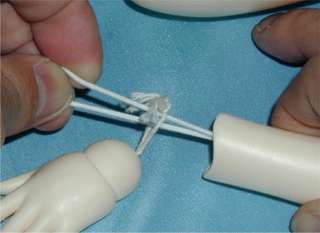 どちらでもいいので足首を引張って、ゴムひもと足首パーツの紐との結び目を見えるようにします。 |