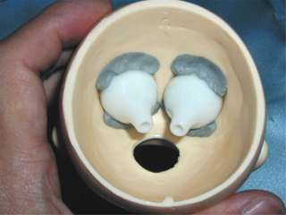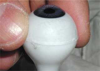 ここではグラスアイの取外しについて解説します。写真のようにグラスアイはエポキシパテ(グレーの物)で固定されています。 エポキシパテの接着力は時間が経てば強くなりますので、新しい子ほどはずしやすいと思います。 又、ののタイプなどは横にもパテがついてることがありますので、はずす工数が大きいですね。 デフォルトでついているグラスアイは22mmのグラスチックアイです。東急ハンズなどで売っていてペア1000円くらいのものです。例外としてりおは24mmでした。 |