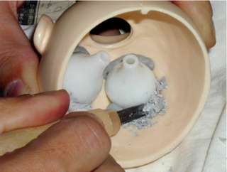 彫刻刀を平刀や浅い半丸刀や小刀など削りやすい物に適宜変えて残りのパテを削っていきます。 |