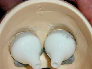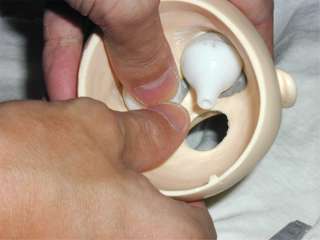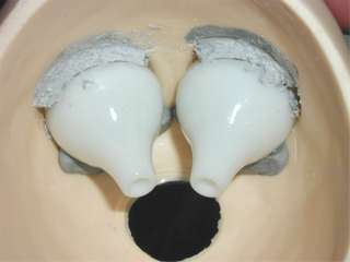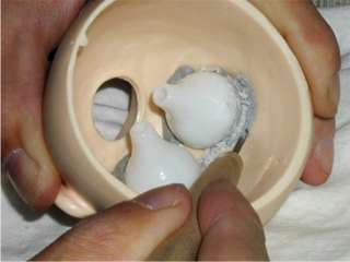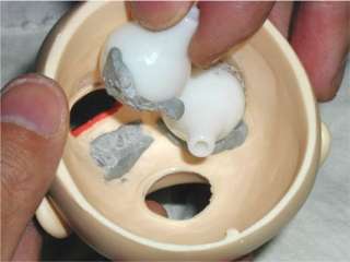 ドールアイのおしりの出っ張りを首の方に押し下げるように押します。メイっぱいがんばりましょう^_^;。 てこの原理で下側のパテをねじるようにして割ってしまおうという外し方ですね。 |