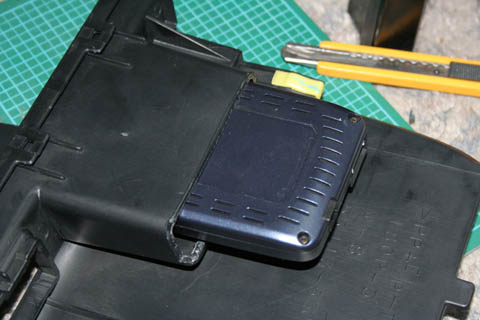 | さて、本体の設置場所もマネして純正オーディオ下の小物入れ部分。 そのままでは奥行きが足らないので裏を切り取ってしまいます。 切り取り方法はホットナイフとかを持っていれば楽ですが持ってないので、半田ごてで大まかに溶かして最後はカッターナイフでサクサクといきました。 |