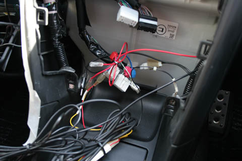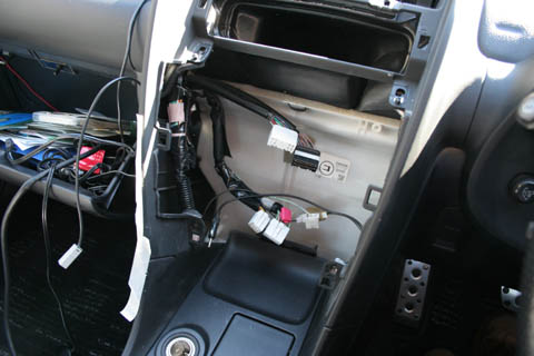 | 配線が終わった状態。 アースは純正オーディオ取り付け用の右下のボルトに共締めしました。 (画像では上から差し込んでますが横向きにしないと干渉するのであとで直してます) アンテナと電源のケーブルが余裕を持った長さになってるのでかなり長くてかさばります。 このあとはこのケーブルをうまく収めて純正オーディオ等を戻します。 |