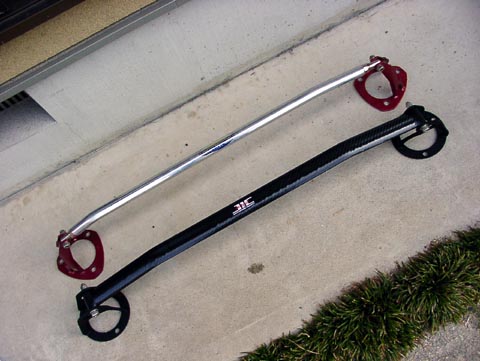 JIC製フロント・カーボン・ストラット・タワーバー GXE10用TYPE-OCS 定価22000円(税別) 平野タイヤ価格15230円(税込) 送料630円、メーカー送料630円 (いずれも税込) 画像上のスチール製のタワーバーはSPATS製SXE10用です。 以前に未使用中古品を購入しましたが、取り付け不可でした。 |