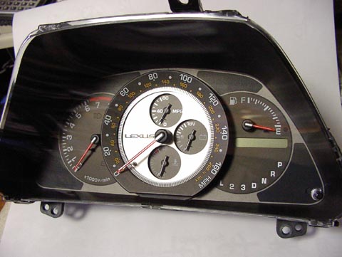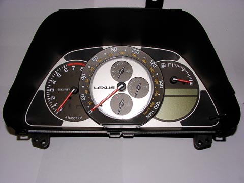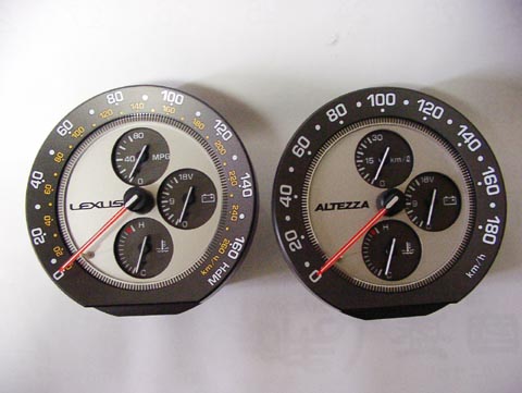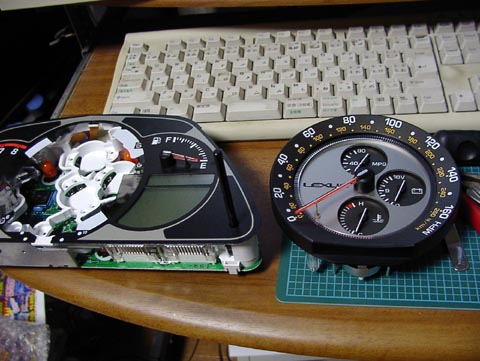 | スピ−ドメーター裏側。 左が補正済みのLEXUSメーターですが、見てもどう変わっているのか判りません。 たぶん真中の金属カバーの中に有るコイル?を変更か調整してあるのだと思います。 |