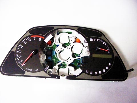 さらに、スピードメーター部分を外す。 裏の電極ピンでとまっているだけなので真っ直ぐ抜くだけですが、下手に抜くとピンが弱く折れる危険がありますので慎重に。 私はマイナスドライバーにテープを巻いて傷を付けないように横の隙間に挿し込んで少しずつ持ち上げていきました。 |