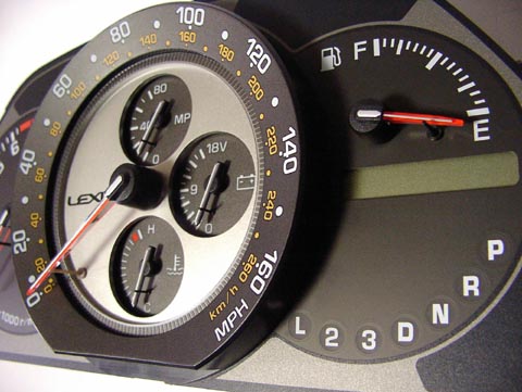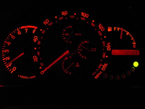夜間のライトON時。 マイル表示がメインなので「いま何キロで走ってるのかなぁ?」って時には見辛いです。 針の動き自体も元の約2/3になり実用的には不便になったとも言えますね(w 260km/hまで表示があってもリミッターで180km/hまでしか出ないですし。 実際に使う速度としては高速道路でも130km/hくらいだと思うし。 針が右側へ行くのを見る機会はほとんどないでしょう。 |