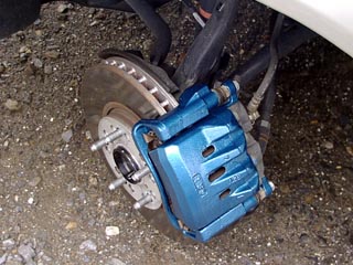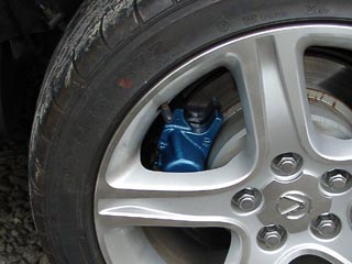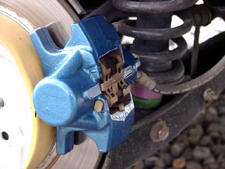 塗装後のリアキャリパー こちらも1回塗り。裏も塗ってません。 リアはフロントのように角度が変えられませんので、裏のほうは塗りにくいです。 意外と盲点なのが筆が長いと筆のお尻がインナーフェンダーに当たって自由に筆が動かせない場合があります。 |