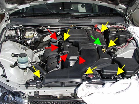| プラグ交換をするにはまずエアクリーナーボックスを兼ねたヘッドカバーを外す必要があります。カバーを外すのは上の図の黄色の矢印の所のボルト(10ミリ)を外します。 向かって右奥の2本がアクセスしにくいので長いボックスレンチがあるとやりやすいです。 また向かって左側のカバーも外す必要があるので赤い矢印の所のボルトも外します。 緑の矢印はエアフロセンサーのコネクタです。これはツメを外して引っ張れば抜けます。 最後に右側のスロットルボディがパッキンではまっているので内装ハズシなどで軽くこじってやればカバー全体が外れます。(スロットルワイヤーがカバー奥側で2ヵ所引っ掛けてあるので、これも外しておくのを忘れないように) |