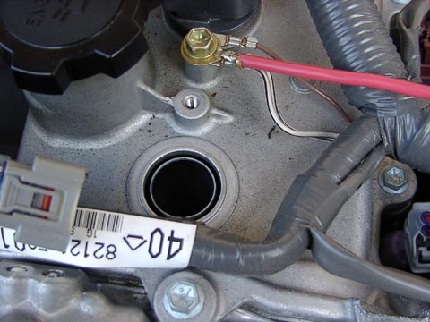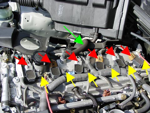 | カバー左側がブローバイ・ホースで繋がっていますが、そのままで左に開くように持ち上げれば大丈夫です。(緑の矢印) 黄色の矢印がプラグのキャップ(?)を止めているボルトです(10ミリ)、これを外し更に 赤い矢印のコネクタをツメを外して引き抜きます。これでキャップが抜けますがちょっとキツイので内装ハズシなどでテコの原理を使って持ち上げると楽です。 |