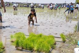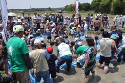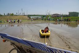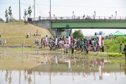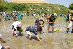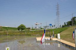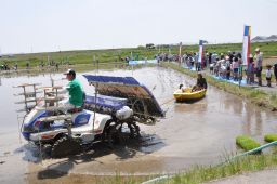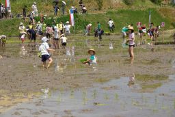 田植え後は田植機に引かれたボートに乗って田んぼ遊覧 |