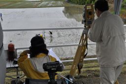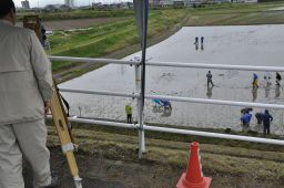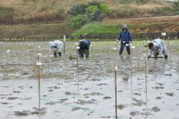 連日の雨の中、めぐしをつないで輪郭の田植え |