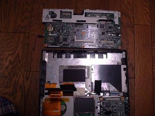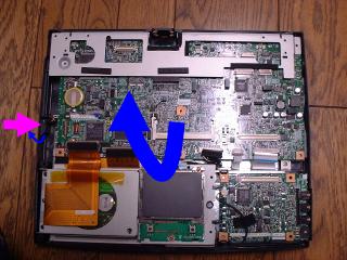 12.写真15のようにPCIカードバスの取り出し棒を立てて押さえながらマザーボードを手前に引き取り外します。