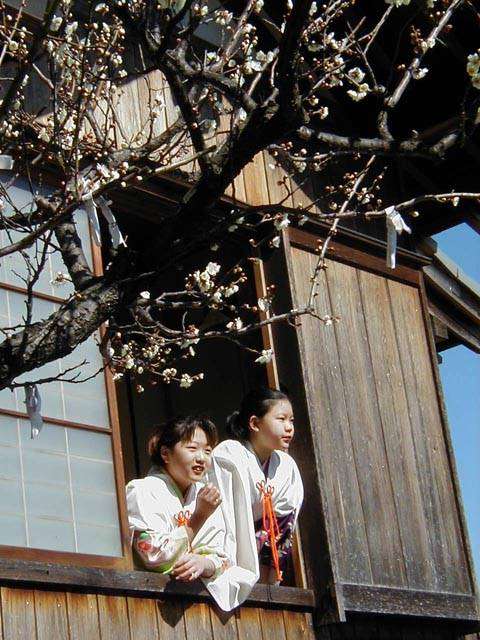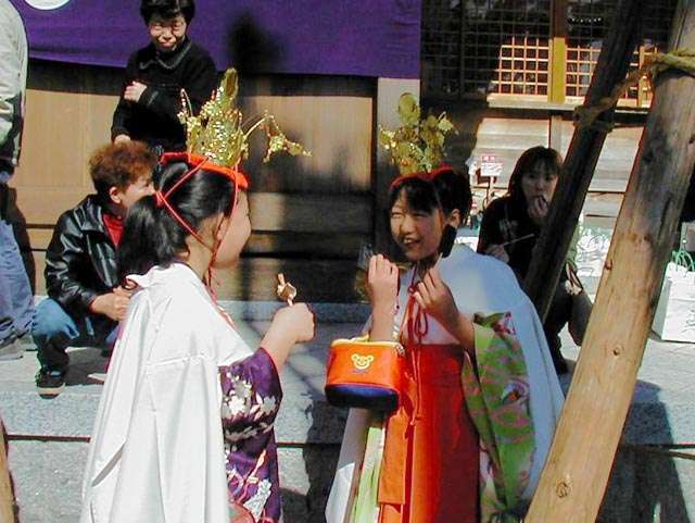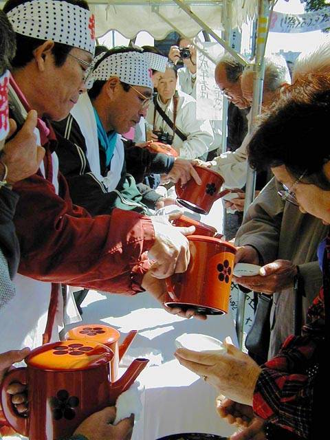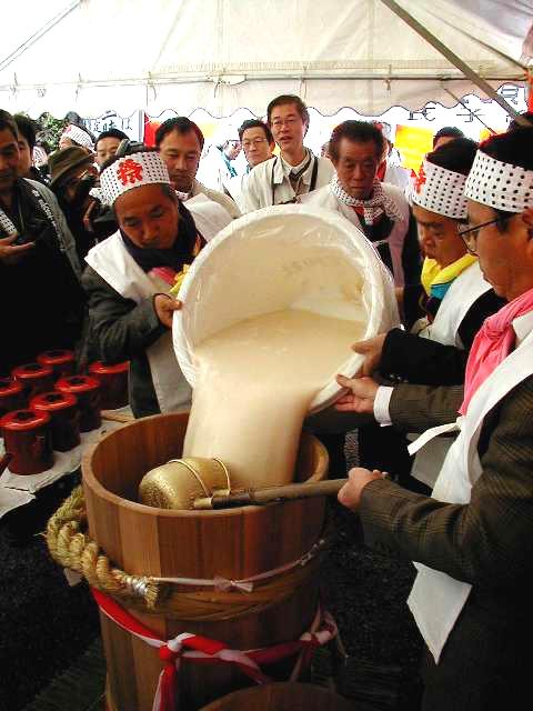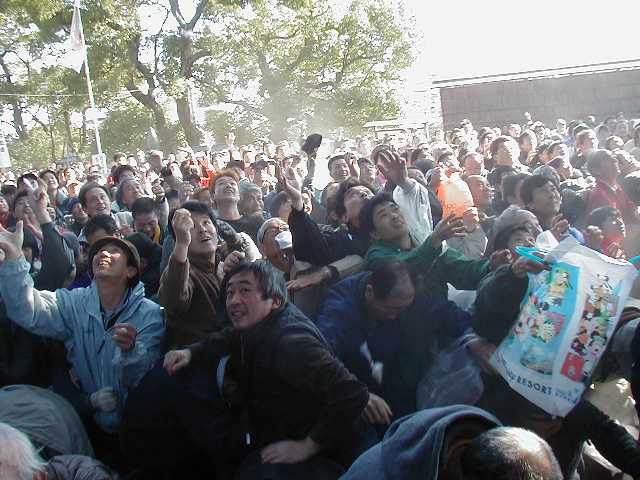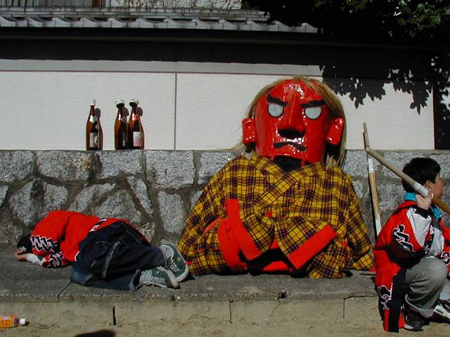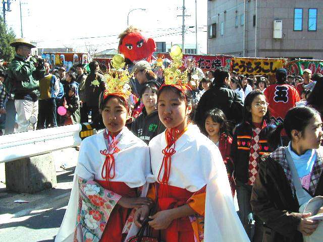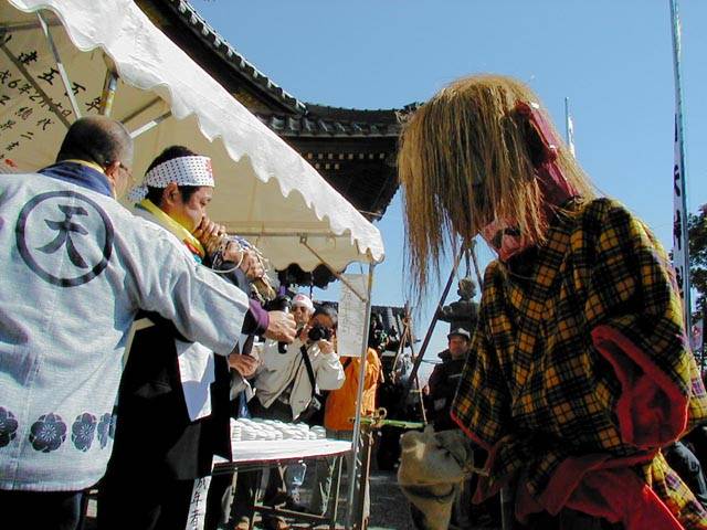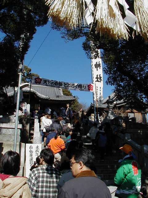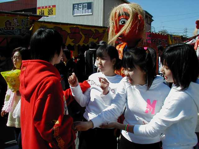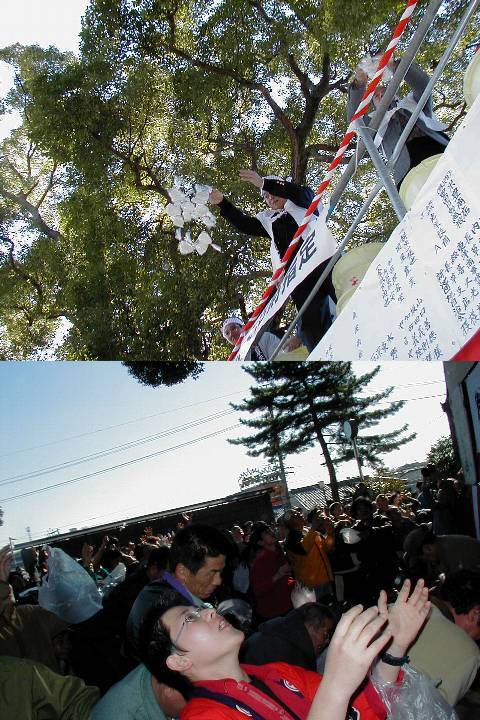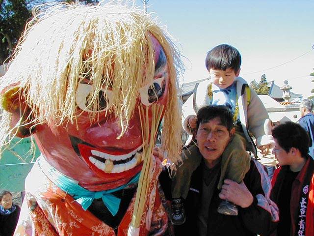 | 天下の奇祭どぶろく祭り 長草天神社 ![]() とき:2002年2月24日 ところ:愛知県大府(おおぶ)市 ◆ 愛知県大府市に長草天神社というところがある。 天神様、すなわち学問の神様菅原道真公を奉った、 500年の由緒ある神社である。 毎年2月第4日曜日はどぶろく祭りで賑わう。 上の写真は猩々(しょうじょう)という想像上の怪獣。 地元に伝わる伝説とからんで境内をにぎわす。 手に持った青竹で頭をたたいてもらうと、 子供は頭が良くなり、年寄も無病息災で長生きをするという。 絵になるのは、「猩々と、親に抱かれて泣きじゃくる幼子」といった構図なのだが、 なかなかそうはうまく撮れるものではない。 むしろ、和やかに並んで記念撮影という風景のほうが多いのは、 ご時世がら致し方がないか。 お稚児さん(1,2,3)も絵になる対象だ。 どぶろく祭りは猩々が酒を好むというところから来ているらしい。 正午、朗々たるほら貝の音とともに振舞い酒が始まった。 今年のどぶろくのでき映えは実に上々だった。 猩々も疲れる。 中に入るのは「青年会」のお兄ちゃん達。 やたら若いので年巾を聞くと、「25歳以下中学生まで」だという。 ふむふむ、どうやら重労働は中高生の役回りか。 どうりで猩々周辺はいつも女子中生がキャピキャピはしゃいでいる。 祭りのフィナーレは「投餅」だ。 どうでもいいが、、、「なげもち」「まきもち」であって、「もちなげ、もちまき」とは言わない。 午後3時! やぐらの上から投餅が始まると、たちまちもうその下は興奮のるつぼ。 まるで万札の紙吹雪を追うように、大のオトナ達が必死で餅をかき集め奪い合う。 うっかり転んだりしたら、生命の危険すら、、、と思うほどだ。 そうこうしてやがて祭りは終りを迎えた。 |