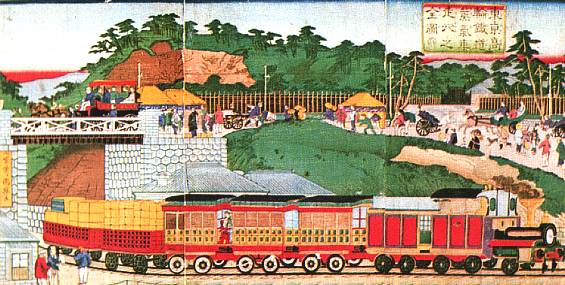先日、名古屋で骨董祭を眺め歩いていたら、見覚えのある鉄道錦絵(下)にお目にかかった。