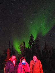 夜9時にホテルからオーロラツアーバスが出る。 ホテルのある市内は、さすがに漆黒の夜にはならないので、郊外に行くのだ。 Ingraham Trailを北東へ約30分、 Prelude Lake湖畔の観測地"Aurora World"まで移動する。 20人ほどを乗せたバスは室内灯を消してひた走る。 その車窓には、もうすでに淡いオーロラが見え隠れしている。 今夜は期待が持てそうだ。 |
