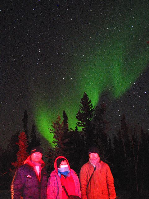 名残惜しいが、いよいよ撤収の時刻がきた。 2時半、皆が乗り込んだバスはホテルのあるYellowknifeの方に向かってゴトゴトと走り出した。 ところが、本当のクライマックスはその後に訪れたのだった。 帰路をひた走るバスが車内灯も消してまもないころ、ガイドさんの声。 「右側にまたオーロラが出てきましたね」 左側席でうつら状態の私には、もうどうでも良かった。 しかし右サイド乗客たちの喧騒が徐々に大きくなっていくのが気になってはいた。 そのうち、「左側にも出てきましたよ」、とガイドさんの声。 やおら、人いきれでガシガシに凍りついた窓ガラスの霜を、 ホテルのカードキーでカリカリと削り落として外を見た。 「ウヲ〜!!」 と、その瞬間、思わずはしたない声を上げてしまった。 そこにあったのは、天空から垂れ下がった巨大なカーテンが、 今もどんどん発達しながら降りてくる瞬間だったのだ。 まるで絵に描いたよう。これぞ幽玄の世界! 「ほらほら!」という家内の声に促され、右側車窓も覗いてみる。 そこには天を覆い尽くさんばかり、オーロラが大蛇のようにのた打ち回っている! 「ヒェ〜!」 それから車内は右も左もしばしワーワーギャーギャー状態が続いたのだった。 本当はこんなのを、観測地で落ち着いて見たかったのにぃ!・・・(^^; |