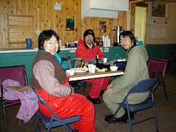 観測地に到着すると暖かい小屋に入り、 オーロラの出現を待つ。 この間、カリブー(トナカイ)のシチューや コーヒーなどを味わう。 バノック(イヌイット族のパン)も 結構おいしい。 (あ、そうそう、子供の頃よく食べた"三角パン"の味だ!) 夜がふけるにしたがってオーロラの 出現回数は増えてきた。 |