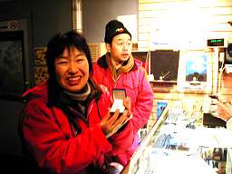 24時を回ってから、 オーロラはどんどん調子が 上がってきた。 記念写真屋さんも天手古舞だ。 うちも記念に1枚Get!→ しかしね、「10秒間止まってて!」 と言われてもね〜。(^^; |