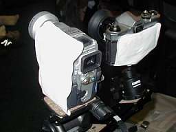 さらにカメラ本体(向う側)の背面と バッグの内側2箇所に 「貼るホッカイロ」を装着。 これで保温もカンペキ(?)。 手前側はダメ元のDVカメラ。 (結果的には全く撮れる対象ではなかった) |