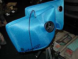 | すぐに決めた方法が、\100-Shopで見つけたクッションバッグ。 これを大小組合せて二重化し、断熱材として利用する。 レンズとファインダーの位置には穴をあけ、 レリーズも装着して完成。 カメラ操作ができるよう、バッグには手が入るスペースも確保した。 これでバッグ下側のチャックを絞れば、そこそこの風防・断熱ができる(ハズ)。 |