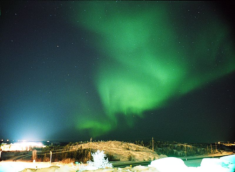 秋の星座ペガサスが下半身を地平線上に残し、オーロラの左にはアンドロメダ姫がいた。