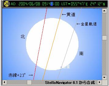 写真と同じ場所・時間にて金星日面通過を地平座標でシミュレートしたところ。 太陽面内の下方に、入ってきたばかりの金星がいる。 半月後に夏至を迎える高赤緯の太陽は、 北緯24度のアラブの地では、午前、ほとんど垂直に近い姿勢で昇っていく。 そして正午には金星を抱いたまま、ほぼ天頂を通過していった。