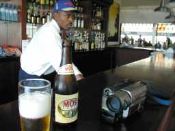 ザンビア・ルサカ空港から発とうとする。 でも、フライトはちょっと遅れるようだ。 時間がある。 ヒマを持て余し、一人BARに入ってビールを所望してみる。 カウンターのお兄さんが何やらあれこれ言ってくるが、よくわからない。 めんどうなので適当なところで、"Oh Yes !" と返してやったら、 Zambia名産"MOSI"ビールが出てきた。 銘柄は何がいいのか聞いてくれていたのだったろう。 US$2 を払う。 |