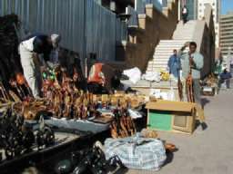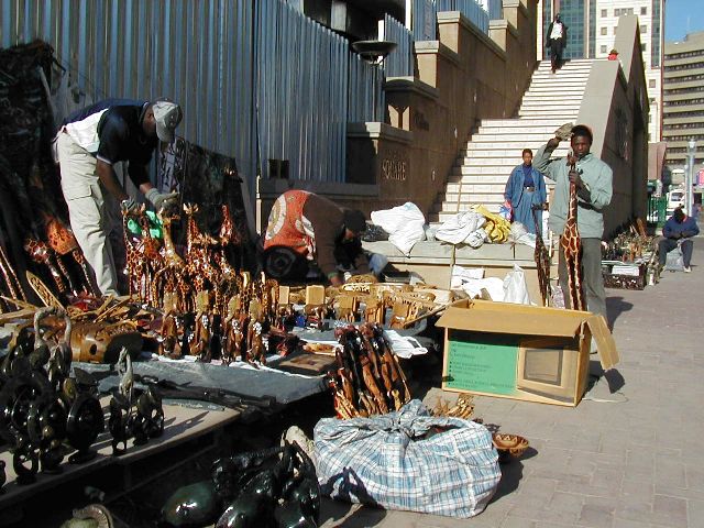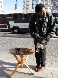 | 私「ランドはもうそんなに持ってない! ドルなら少しあるけどね」 オヤジ「じゃ、$40でどうか」 私「ノーノー高い、ノーサンキュー」 それを聞いていたオヤジのカミさんが、 私が差し出したメモ帳の上で、やおら計算を始めた。 R160=$20 R275-R160=R115 カミさん「だから、$20とR115を払えばいいよ」 しっかりしてるワイ。断れなくなって商談成立。 オヤジさん、またに挟んだ新聞紙で、 土産の彫物を一つ一つ丁寧に包んでくれた。 |
