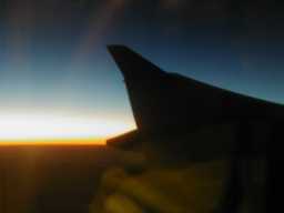 早くもマダガスカル上空で落日を迎える。 往路はちょうどこの辺で朝がきた。 地球の自転と同じ東向き空路は、 まるで早回しビデオのように時が進む。 ・・・ヒマだ。することもない・・・寝るか・・・ ・・・・・・zz・・z・・・・zz・・・・z・・・(ん、寝れん、、、)・・・ |