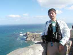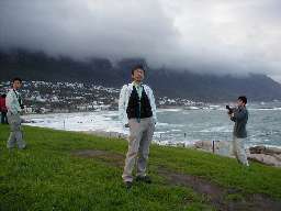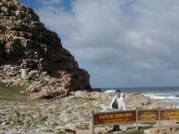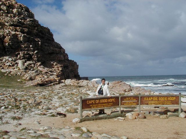 ここが"CAPE OF GOOD HOPE"(喜望峰) ところで、私の立っている看板を良く見ると, "THE SOUTH-WESTERNMOST POINT OF THE AFRICAN CONTINENT" と書いてある。 南端でも西端でもない「最南西端」だって! 世の中、南東端とか北北西端とかもあったっけ? この歳まで知らんかったぁ。 |