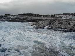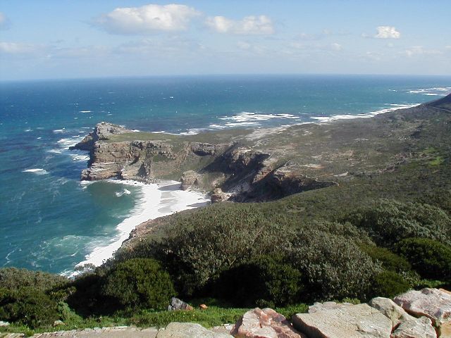 やってきました、ケープ半島最南端 (最XXというのはどこでも曲者だが、、、) ケープポイントの展望台から西側を見たところに あるのが、かの有名な「喜望峰」なのだ。 |