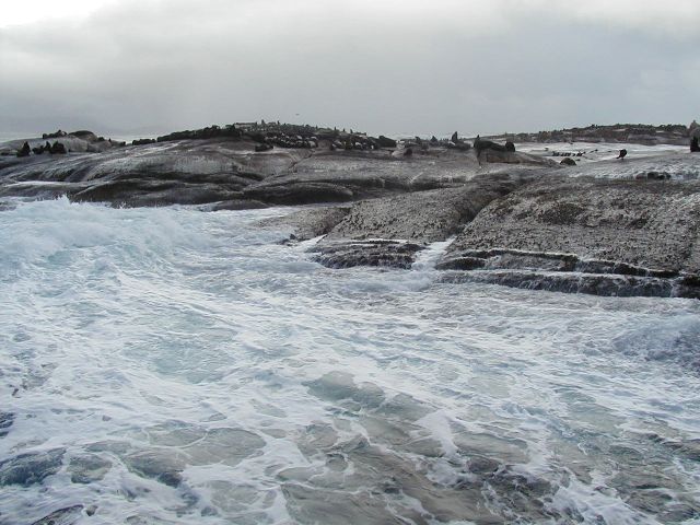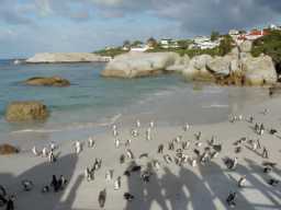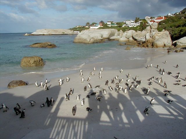 アフリカペンギンの群生地。 わけありで、ここに住み着いてから30年ほどたつという。 ペンギンに理由を聞くと、 「ここに住んでいると、いろんな種類の人間共が 入れ替わり立ち代り来るので、飽きない」 んだって。 なるほど、いるいる人間の群れ(影)。 |