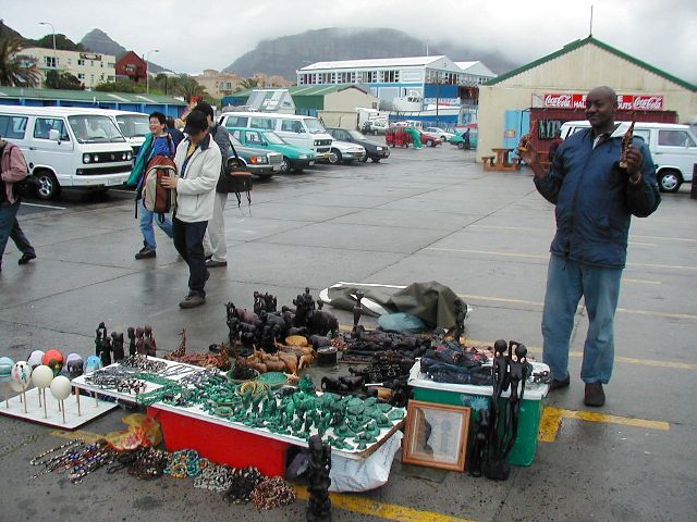 ハウトベイに帰りつくと、 地面にみやげ物を広げたおじさんが、 Nice look !, Nice look ! といって観光客に愛想を振り撒いている。 持っているのはキリンの彫り物。 右端はオストリッチ(ダチョウ)の卵の細工だ。 |