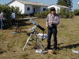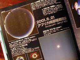 星ナビ2001年10月号はアフリカ日食写真コンテスト号だ。 ツアー仲間の入賞写真が続々と、、、! 大崎さんの「全天」魚眼写真は、全周の夕焼け色がきれいだ。 森永さんの「ビクトリアフォールズ」は、二重の虹が大瀑布の迫力を伝えている。 (左下写真左) 高橋さんの「極大期のコロナ」は外部コロナの外側まで広がる放射状光線が見事だ。 (左下写真右中段。 因みに下は高橋さん準備中の現場写真) |