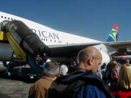 ここから国内線でケープタウンに向かう。 アフリカで飛んでる飛行機ってどんな飛行機だろうと思っていたら、 なんのことはない、見なれたジャンボだった。 南アフリカ国旗と同じ、赤、緑、黒、青の原色の尾翼が、 紺碧の空を突き上げるようにダイナミックにそびえていた。 |