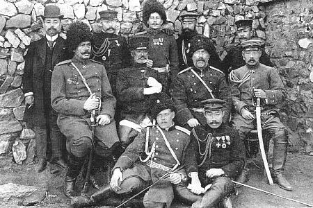 後列左から、川上外務書記官、安原大尉(参謀)、マルチェンコ中尉(参謀)、松平大尉(副官)、渡辺少佐(管理部長)、