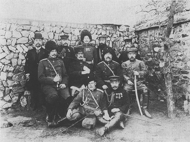 中列に、レイス少将(参謀長)、乃木大将(司令官)、ステッセル中将(司令官)、伊地知少将(参謀長)、