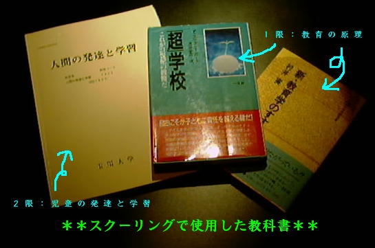 | 期間:平成13年8月2日〜7日 | **使う教科書** 様々。通信のテキストだったり、 一般の書店で売られている本だったり。 私の受講した教科は、一般書あり、 テキストありでした(*^ - ^*)ゞ どうやって手に入れるかというと、 私の場合はインターネットで購入しちゃいます。それが一番てっとり早い。今回は1週間前に注文したので届くかどうかハラハラドキドキでした(−。−;) でも、授業はプリントで進みました。 |