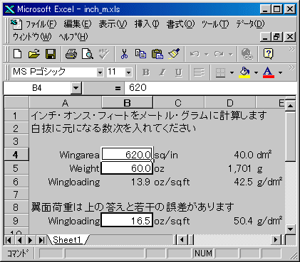 インチ・オンス・フィートで表示されている機体データをメートル・グラムに変換します