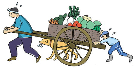 | 夏には、三河は明治用水のおかげで、夏野菜がたくさんとれたので、 尾張から八百屋さんが、リヤカーや大八車で、吉浜の青果市場に仕入れにきました。 そのころ知多郡は、まだ愛知用水がなかったので、夏野菜が、ほとんど 穫れなかったのでした。 八百屋さんが、大八車に、西瓜や茄子、トマト、きゅうり、南瓜などを、 いっぱい積んでくると、遊んでいた子どもたちが、一斉にとんできて、 子どもー壱「おじさん、手伝うよ」 子どもー弐「おれも、手伝うよ」 子どもー参「みんな一列になって、手渡しだぞ」 おじさん 「おとすなよ~」 と、たのしいことでした。 おじさんは、荷積みの作業が、終わると、子どもたちに、お駄賃をくれました。 大正・昭和のはじめころの船賃は、大人が二銭、子どもが一銭、 それに自転車が二銭、少し大きな大八車やリヤカーは五銭でした。 風の強い日には、二人の船頭さんが、二丁櫓でこぐので、船賃も二倍になりました。 そのころ、アンパンが二銭でした。今は百円位、吉浜から高浜港までの 電車賃が、五銭だったのですが、今は百九十円です。(参考:令和元年頃) |