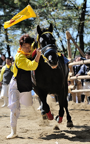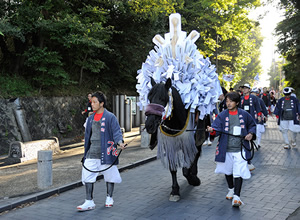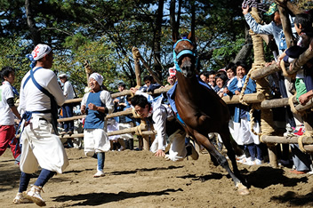 愛知県尾張地方や西三河地方(現在の高浜市、刈谷市、安城市、碧南市、知立市)の丘陵部や平野部で広く行われてきた祭りの一つに「馬の頭=塔(うまのとう)」があります。これは雨乞いや豊作を祈願して、神の依り代(よりしろ)となる御幣(神祭用具の一つで、紙または布を切り、細長い木に挟んで垂らしたもの)を背に乗せ、飾り馬具(鈴をつけた鞍「鈴鞍(れいくら)」や花などで飾り付けた馬具)をつけた馬を社寺に奉納するという「飾り馬献納」と、馬場で馬を走らせる「走り馬」の2つの行事による祭礼で、その表記は「ウマノトウ」「オマントウ」「オマント」「献馬」「飾馬」「花馬」と土地によって様々です。 名古屋の熱田神宮では、5月5日に行われる祭礼で、神事に奉仕する者は「頭人」、馬に関わる者は「馬頭人(ばとうにん)」と呼ばれていました。この馬頭人こそが馬の頭の由来になったとも言われ、熱田神宮の馬の頭では、飾り馬を奉納する「本馬(ほんうま)」と、派手な出で立ちの人々が剣祓(けんばらい/剣先の形をしたお札)をつけた裸馬につながれた綱をもって共に走る「俄馬(にわかうま)」が行われていました。特に後者は「熱田の走り馬」として知られ、これが派生し、知多湾岸の各地で独自の発展を遂げたのが「おまんと」だと考えられています。 |
