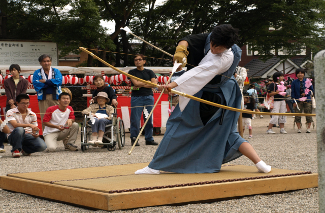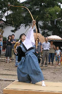 祭礼の日の早朝から夕方までに4回、日の出と日の入りの方向に白羽の矢を射放つ |