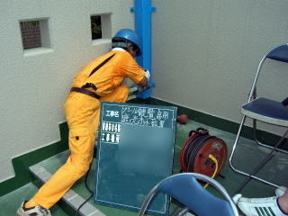 真夏の炎天下、遮光ネットを張り
