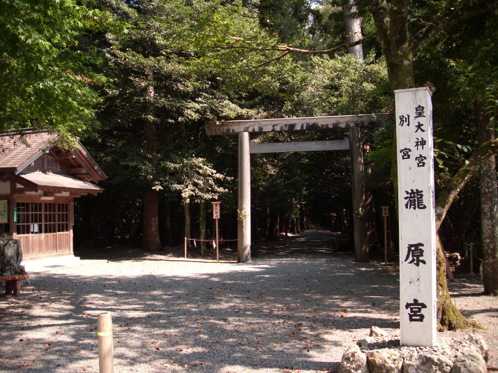 | 瀧原宮(たきはらのみや)・瀧原竝宮(たきはらならびのみや)は、ともに皇大神宮の別宮で、 神宮の遥宮(とおのみや)とも言われている。 御祭神はどちらも、天照坐皇大御神魂(あまてらしますすめおおみかみのみたま)で、 両宮ともに同じ宮域に御殿をならべて鎮座されている。 鎮座地は、 伊勢市の西部を流れる宮川の河口から約40キロの上流、宮川の支流である大内山川が流れる、三重県度会郡大紀町にある。 |