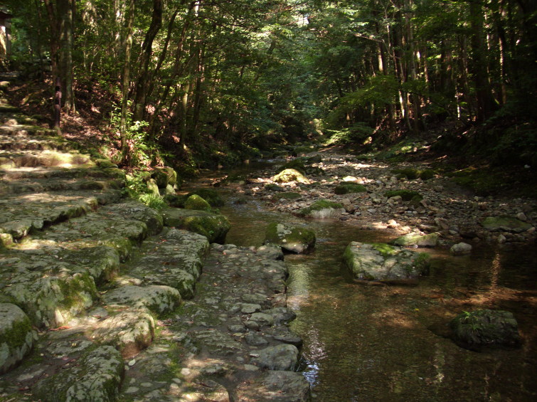 参道に掛かっている橋を渡り、神職が常時勤務している宿衛屋の手前を右に曲がって、川に向かっておりていくと、 |